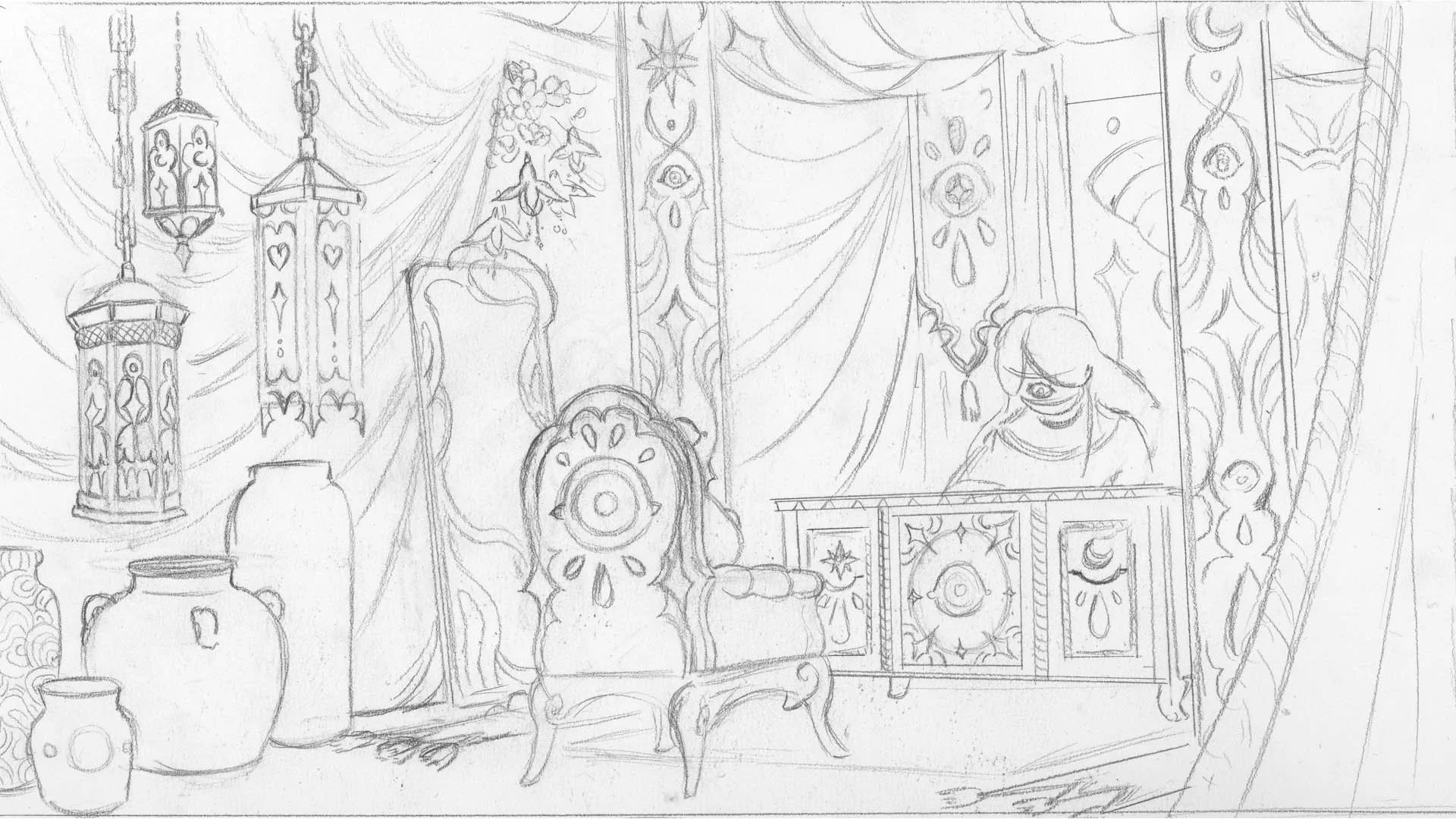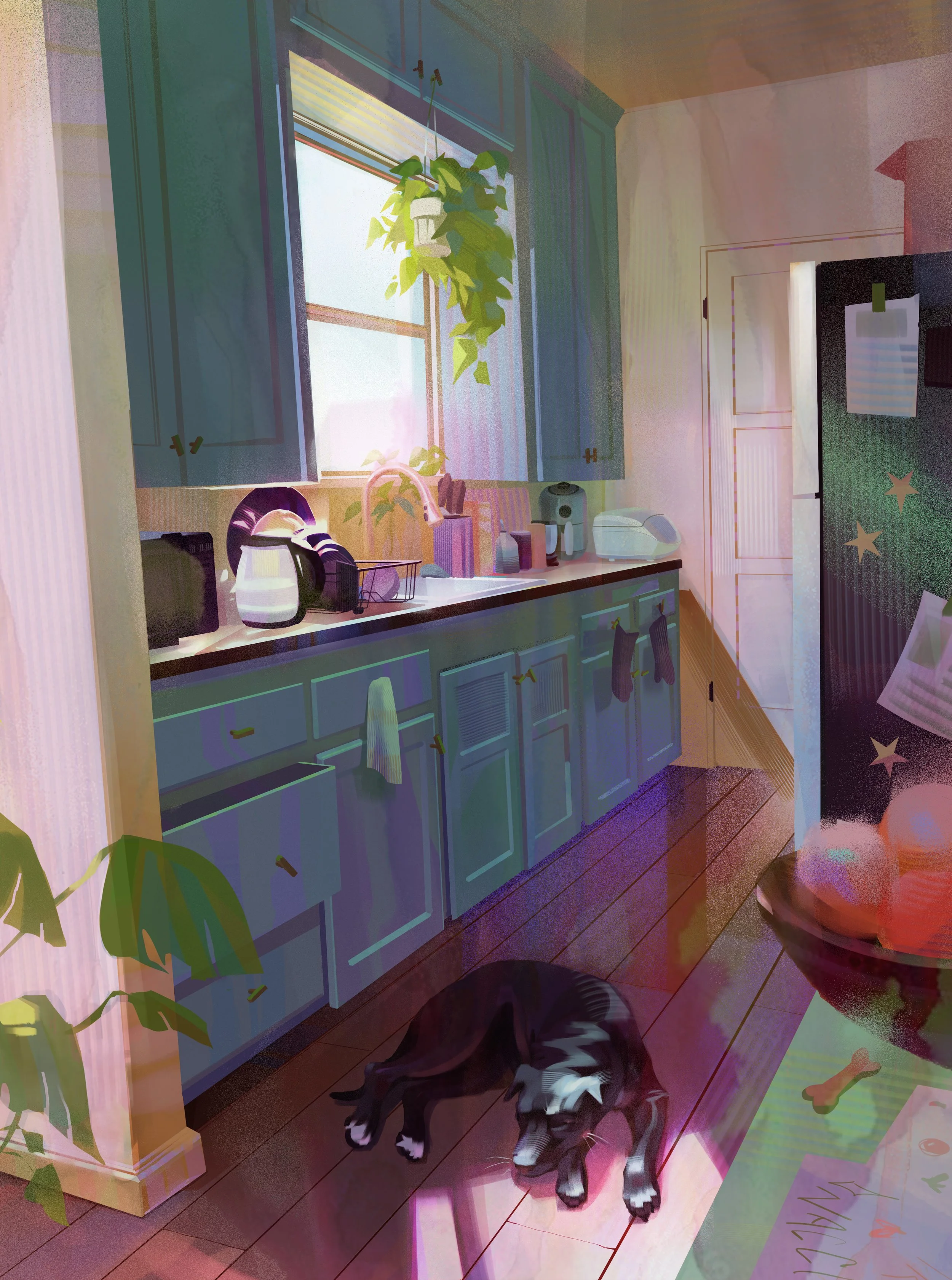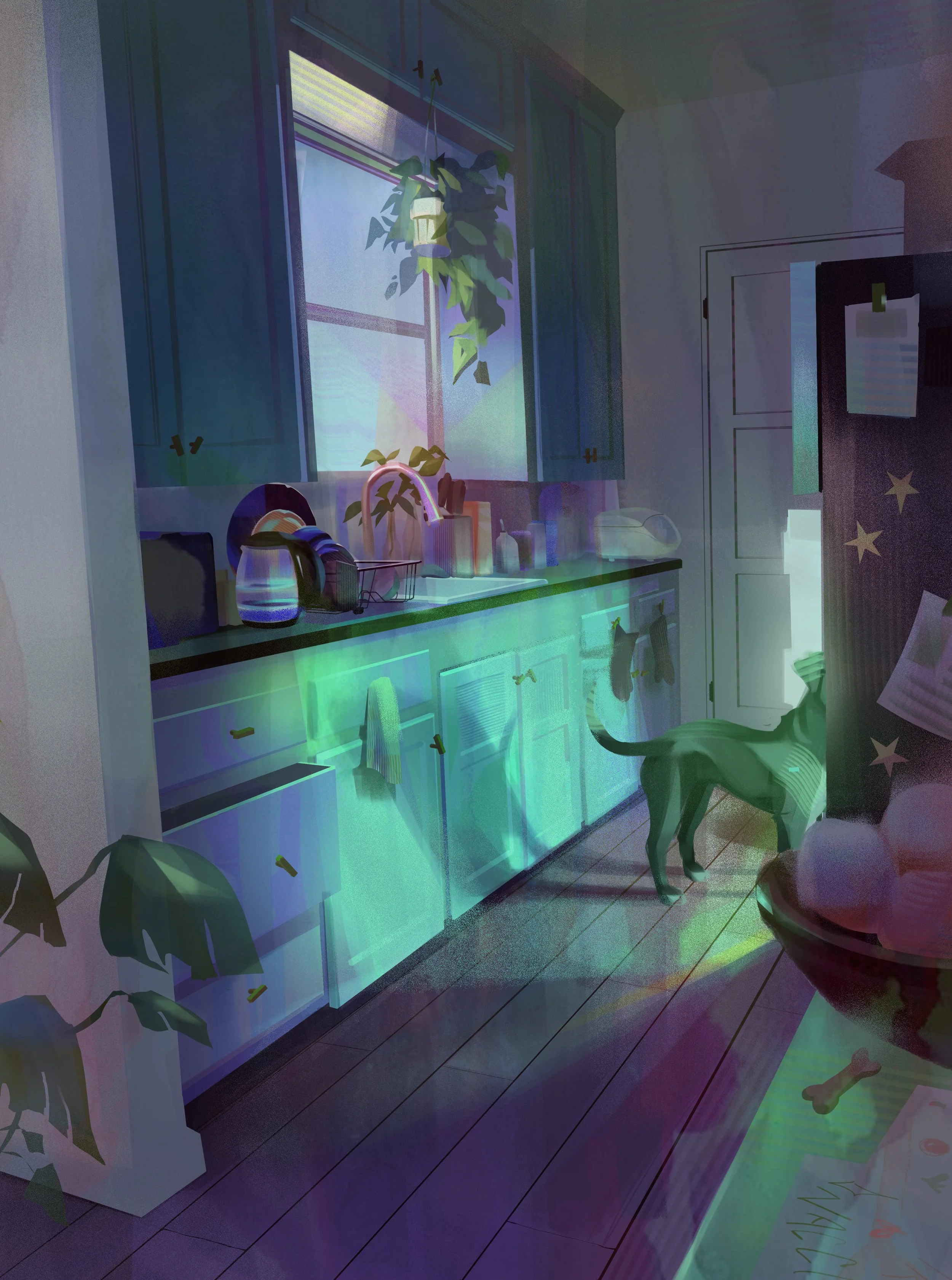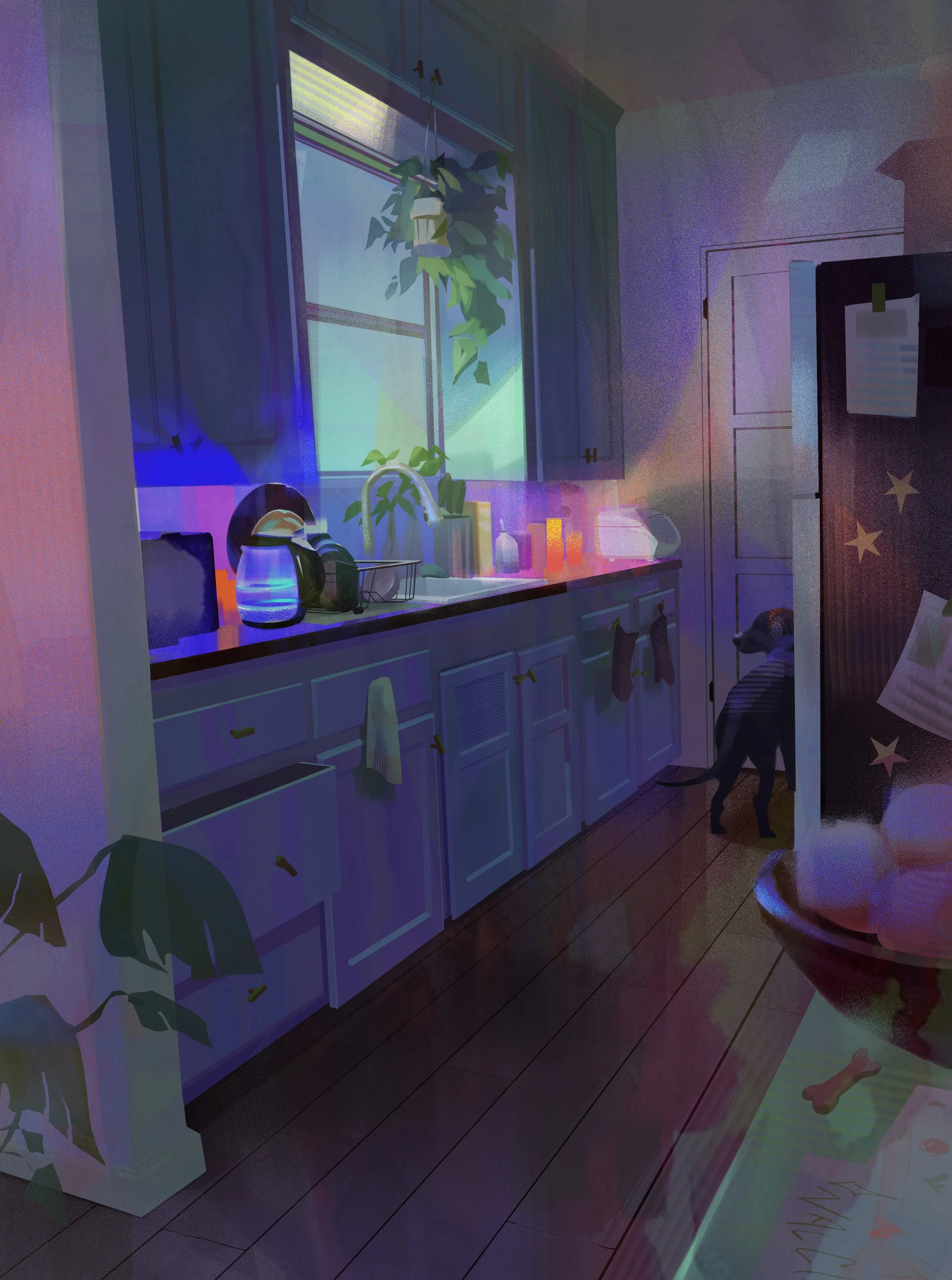 Background design and paint for game jam, “Book of Bark”; a narrative-driven witch sim where you play as Barnaby, a loyal dog familiar, trying to keep your witch's shop open when she falls under a mysterious hex.